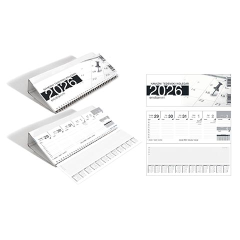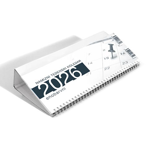 Namizni ležeči koledar 2026 – enobarvno in pregledno leto na dosegu roke. Praktičen in estetsko oblikovan namizni ležeči koledar, popoln za pisarno, dom ali recepcijo. Ležeči namizni koledar 2026 omogoča hiter pregled nad tednom, mesecem in pomembnimi datumi, zaradi česar je nepogrešljiv pripomoček pri vsakodnevnem načrtovanju. Enobarvna izvedba in jasno označeni prazniki ter vikendi izboljšajo preglednost, zato je ta namizni koledar 2026 idealna izbira za vsak delovni prostor, kjer sta učinkovitost in organizacija na prvem mestu. Za ogled ostalih koledarjev iz rubrike namizni koledarji kliknite tukaj. Ogled koledarjev s podrobnejšimi opisi najdete na povezavi spletne strani www.tiskovine-naroci.si.