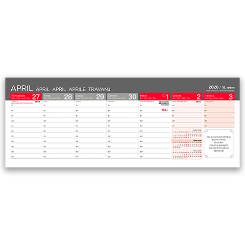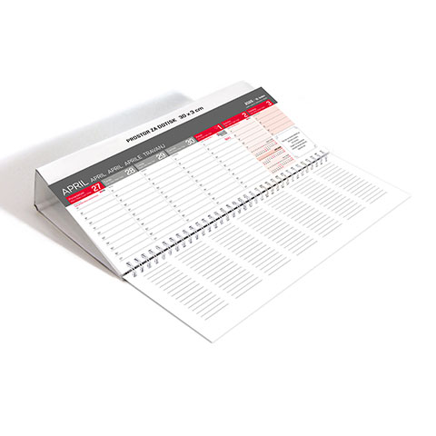 Prostor za dotisk: 30 x 3 cm; Minimalna količina: 5 kos; Format: 30 x 10,5 cm; Vezava: špiralna + fiksno stojalo trda lepenka; Rok dobave: 5 – 15 dni; Večjezični: DA – petjezični; Prazniki: DA; Lune: DA, Imena: DA
