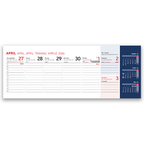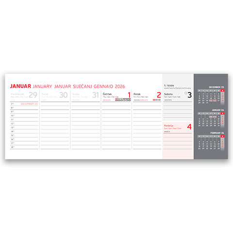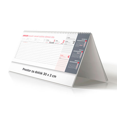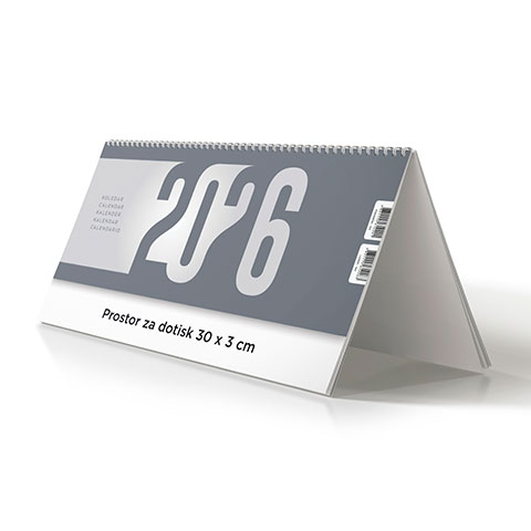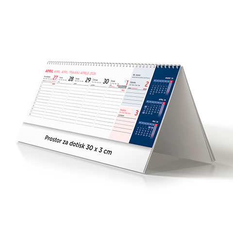 Prostor za dotisk: 30 x 3 cm; Minimalna količina: 5 kos; Format: 30 x 11,5 cm; Vezava: špiralna + fiksno stojalo trda lepenka; Rok dobave: 5 – 15 dni; Večjezični: DA – petjezični; Prazniki: DA; Lune: DA, Imena: DA