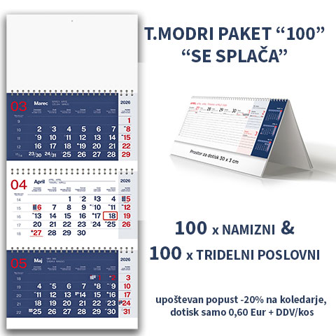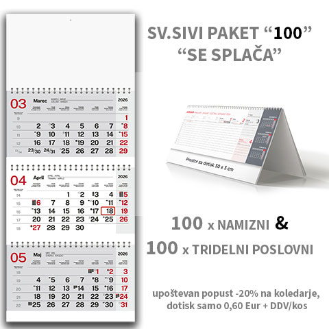 PAKET “SE SPLAČA 100B” – namizni pokončni koledar + tridelni poslovni koledar 2026 – EG; 100 x namizni pokončni + 100 x tridelni poslovni koledar. Za ogled ostalih koledarjev iz rubrike TRIDELNI KOLEDARJI kliknite tukaj. ; NAMIZNI KOLEDARJI kliknite tukaj. Ogled koledarjev s podrobnejšimi opisi najdete na povezavi spletne strani www.tiskovine-naroci.si
