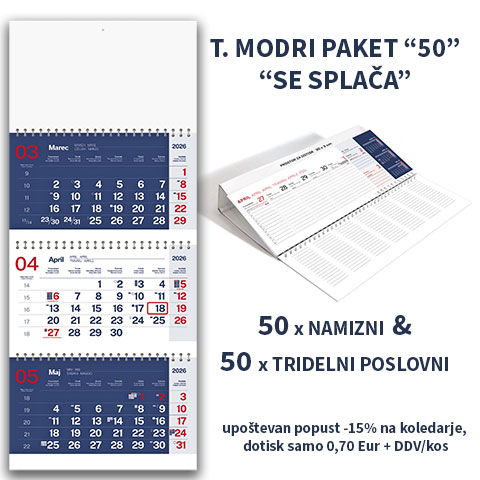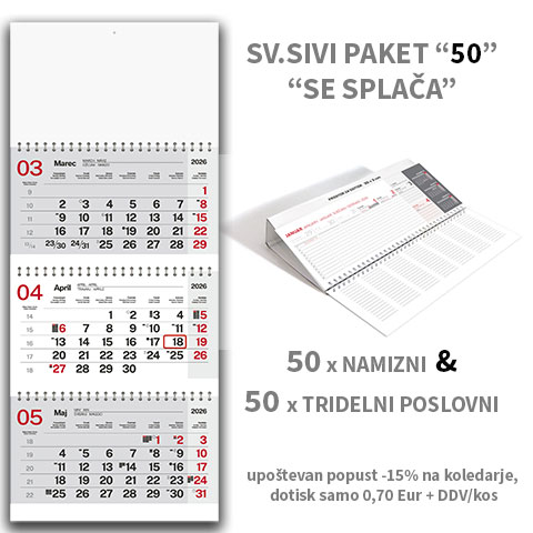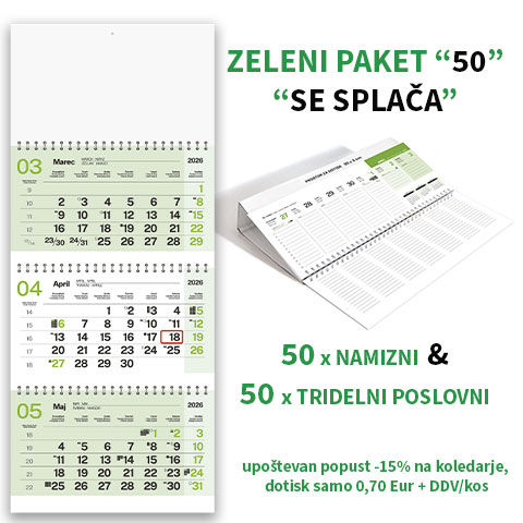 PAKET “SE SPLAČA 50A” – namizni ležeči koledar + tridelni poslovni koledar 2026 – EG; 50 x namizni ležeči + 50 x tridelni poslovni koledar. Za ogled ostalih koledarjev iz rubrike TRIDELNI KOLEDARJI kliknite tukaj. ; NAMIZNI KOLEDARJI kliknite tukaj. Ogled koledarjev s podrobnejšimi opisi najdete na povezavi spletne strani www.tiskovine-naroci.si