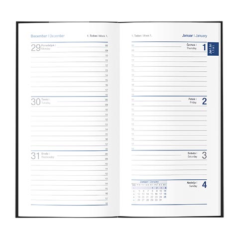 Prostor za dotisk logotipa: 6 x 2 cm; Minimalno naročilo: 5 kos; Velikost planerja: 8 x 16 cm; Vezava: šivano ; Rok dostave: 5 – 10 dni