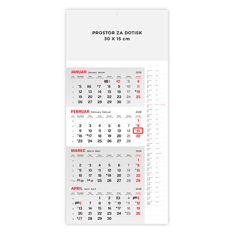 Prostor za dotisk logotipa: 30 x 15 cm; Minimalno naročilo: 5 kos; Velikost koledarja: 30 x 63 cm; Vezava: špiralna; Lune: DA; Imena: NE; Prazniki: DA (slovenski in tuji); Štirimesečni: DA; Večjezični: DA; Rok dostave: 5 – 10 dni
