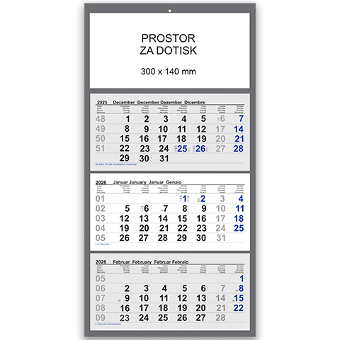 Tridelni lepljen koledar 2026 je elegantna in pregledna rešitev za vsakodnevno načrtovanje. Tridelni koledar omogoča hiter vpogled v tri mesece hkrati, kar je idealno za pisarne in poslovna okolja. Ta lepljen koledar združuje klasično zasnovo z možnostjo dotiska logotipa, kar ga uvršča med priljubljene tridelne koledarje 2026 za promocijsko uporabo. Izberite tridelni lepljen koledar 2026 – preprosto organizirano leto z jasnim pregledom.