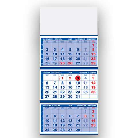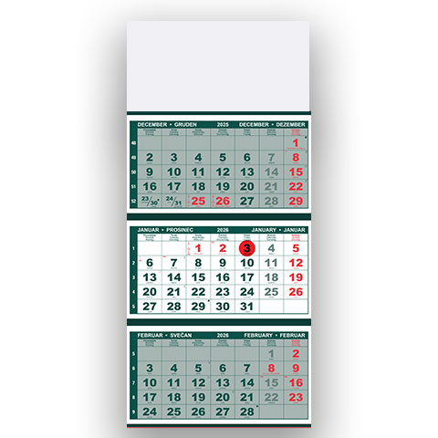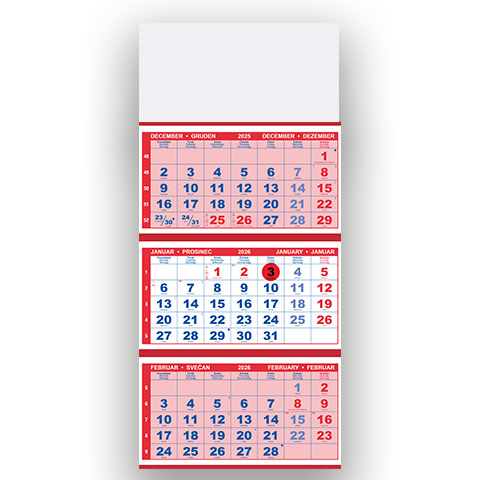 Tridelni lepljen koledar 2026 nudijo pregleden prikaz treh mesecev na enem mestu, kar omogoča lažje sledenje obveznostim. Med tridelni koledarji 2026 izstopajo po enostavni uporabi, čisti obliki in praktičnosti. Kot kakovostni lepljeni tridelni koledarji so odlična rešitev za pisarne in domove, hkrati pa sodijo med najbolj priljubljene lepljeni koledarji 2026 in funkcionalne tridelni koledarji.Za ogled ostalih koledarjev iz rubrike TRIDELNI KOLEDARJI kliknite tukaj. Ogled koledarjev s podrobnejšimi opisi najdete na povezavi spletne strani www.tiskovine-naroci.si