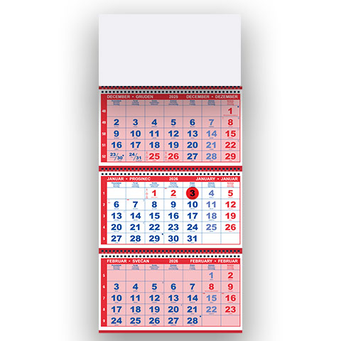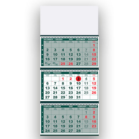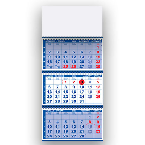 Tridelni špiralni koledarji 2026 so odlična izbira za vse, ki potrebujejo pregleden prikaz treh mesecev hkrati. Med tridelni koledarji 2026 izstopajo s praktičnim spiralnim vezom, ki omogoča enostavno listanje in dolgo obstojnost. Kot kakovostni špiralni tridelni koledarji so del ponudbe, kjer najdete različne špiralni koledarji 2026 in druge uporabne tridelni koledarji za poslovna in osebna okolja. Za ogled ostalih koledarjev iz rubrike TRIDELNI KOLEDARJI kliknite tukaj. Ogled koledarjev s podrobnejšimi opisi najdete na povezavi spletne strani www.tiskovine-naroci.si